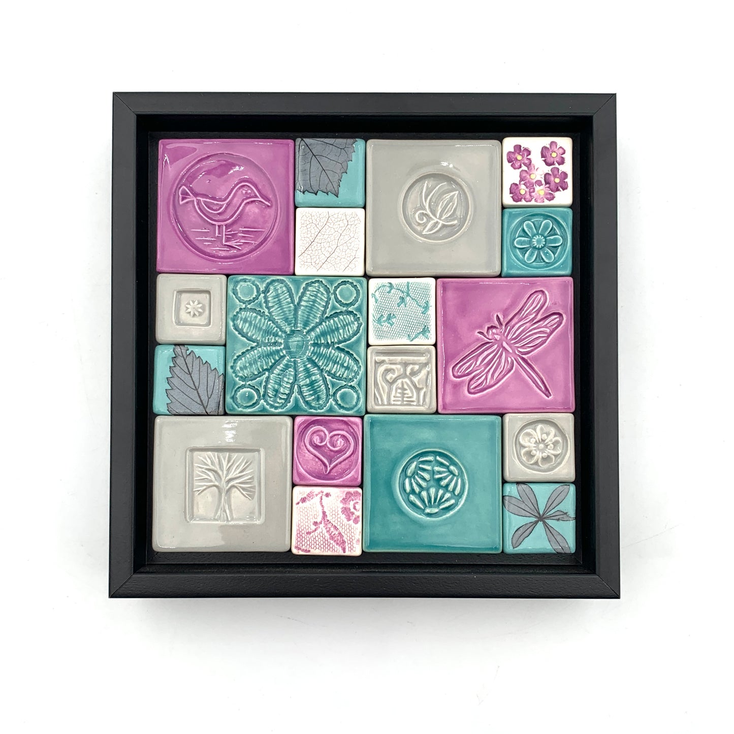 Quilt Tile 6 x 6 purple aqua grey in Black Frame